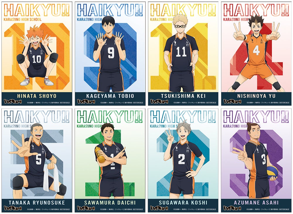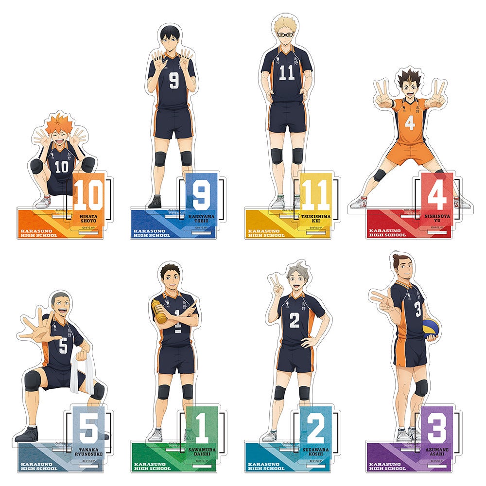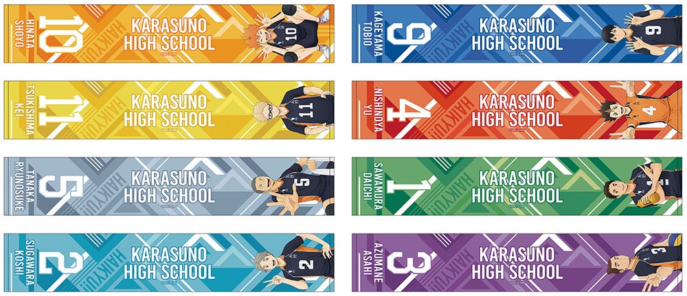 「ハイキュー!! みんなの背番号!烏野高校フェア in アニメイト」では、日向や影山たち烏野高校排球部のメンバー8人が登場。それぞれの個性あふれるポーズで自身の背番号を表現した、新規描き下ろしビジュアルを使用しています。ラインナップは、「アクリルスタンド」、「トレーディング缶バッジ」や、普段使いしやすい「マフラータオル」などが登場。期間は10月26日まで。