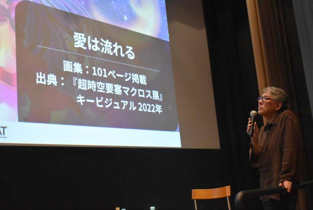 質問者が「『マクロス』でも同じような流れなのでしょうか」と続けて尋ねると、「断片的なアイデアは、『スタジオぬえ』や河森(正治)くんからも出ていました。『愛は流れる』で歌をああいう形に使うというアイデアは、河森くんが途中で思いついたんだと思います。途中まで彼は『どうやってケリをつけるか』ということを考えてた時期があったはずです」と話しました。