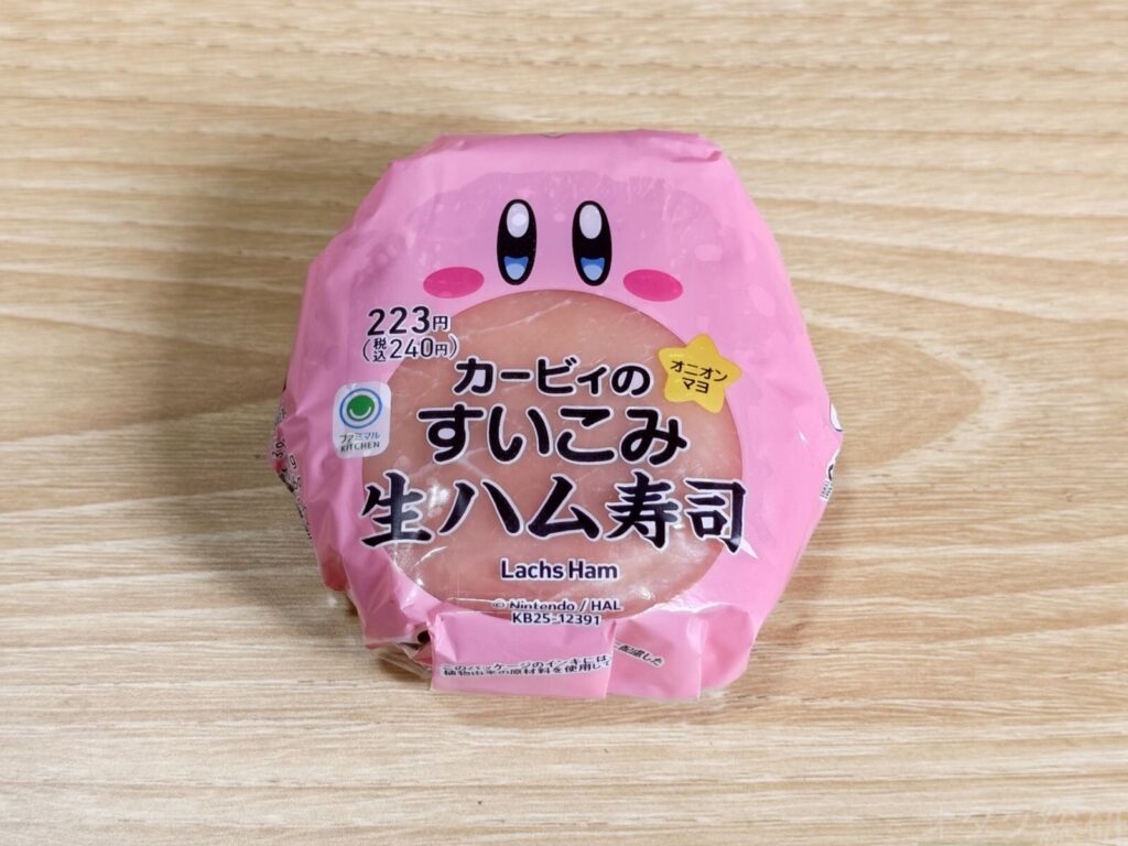 注目は、カービィが吸い込んでいる様子をパッケージで表現した「カービィのすいこみ生ハム寿司」。酢飯の上にオニオンマヨソースをトッピングした、お子様も楽しめる優しい味わいです。