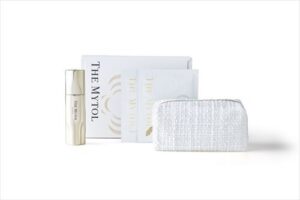 THE MYTOL」シリーズの人気商品(14,300円相当)と、オリジナルのスノーツイードポーチがセット(ザ マイトル エッセンス 30mL 11,000円(税込)+、ザ マイトル 薬用マスク ドライレスキュー 2枚3,300円相当の合計金額)。