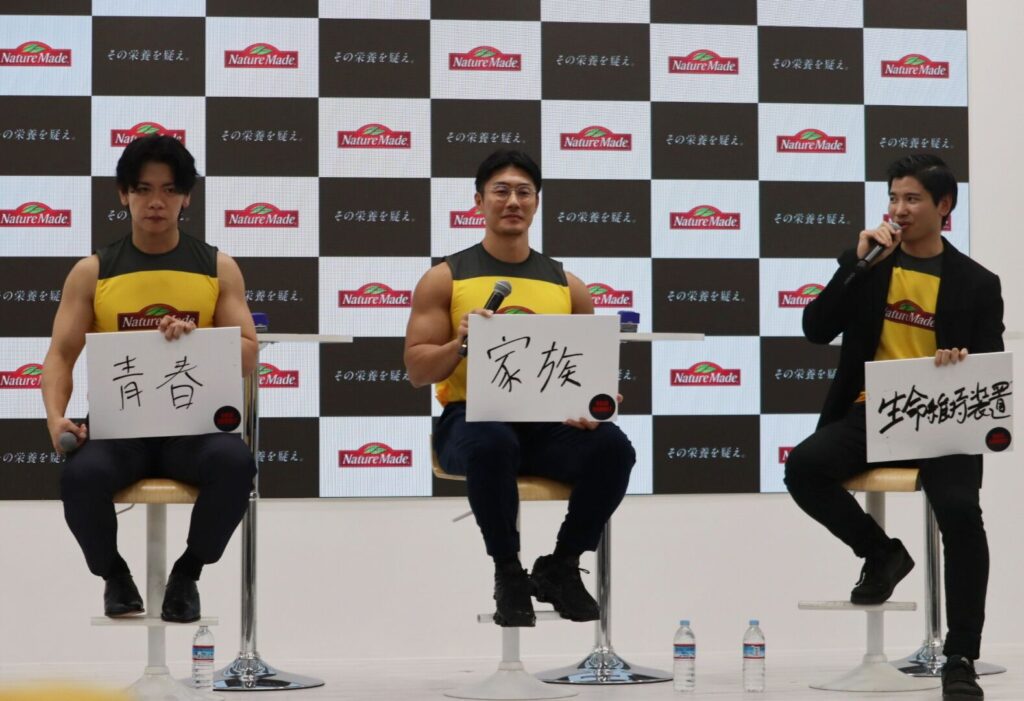 KENTOは「ビタミン、ミネラルとクレアチン。この3つは、特に体の中だと作りにくい栄養素です。食事とか、サプリメントで積極的に個人的には取りたい」と説明。久野は「すべての栄養がもちろん大事なんですけど、特にタンパク質が大事かと。タンパク質をしっかり摂り筋トレを行うと、筋肉を増やすことができますので。こちらを欠かさず毎食摂ってます」と語ると、野田は、幅広い栄養素を意識的に取り入れているが「特にカフェインですね。トレーニング1日の質を上げる、活動的になるという意味でも欠かせない」と笑いを誘いました。