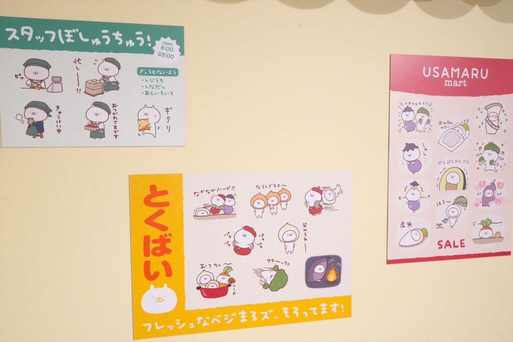 また、うさまるマートのベジまるズやちびちびうさまるなど、派生うさまるたちも大集合。これまでのコラボスタンプなども紹介され、これまでのうさまるヒストリーを追体験できます。各展示物にはsakumaru氏の一言コメントが華を添えています。イラストや立体物などの隠れうさまるも探すのが楽しいポイント。