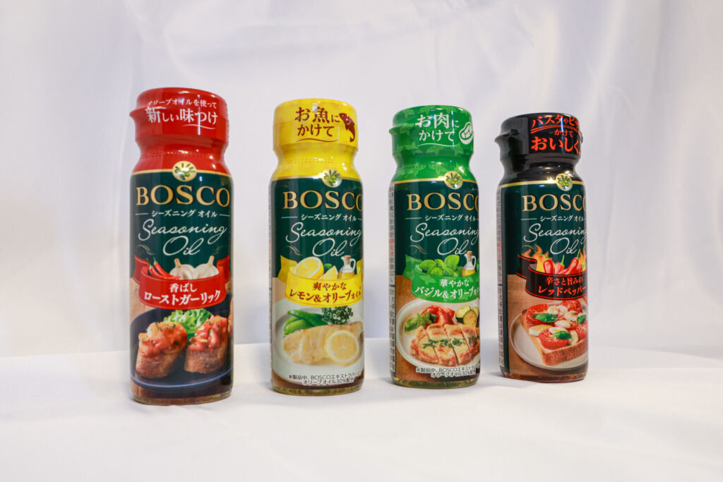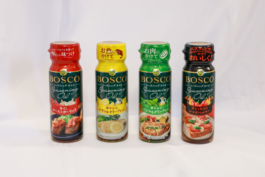 「BOSCOシーズニングオイル」は、料理の味つけや仕上げにかけるだけで、手軽に便利に、本格的な味へランクアップさせることができる。全5種類と風味のバリエーションも豊富なため、料理ごとに種類を変えていつもとちがう味と香りを楽しめる。