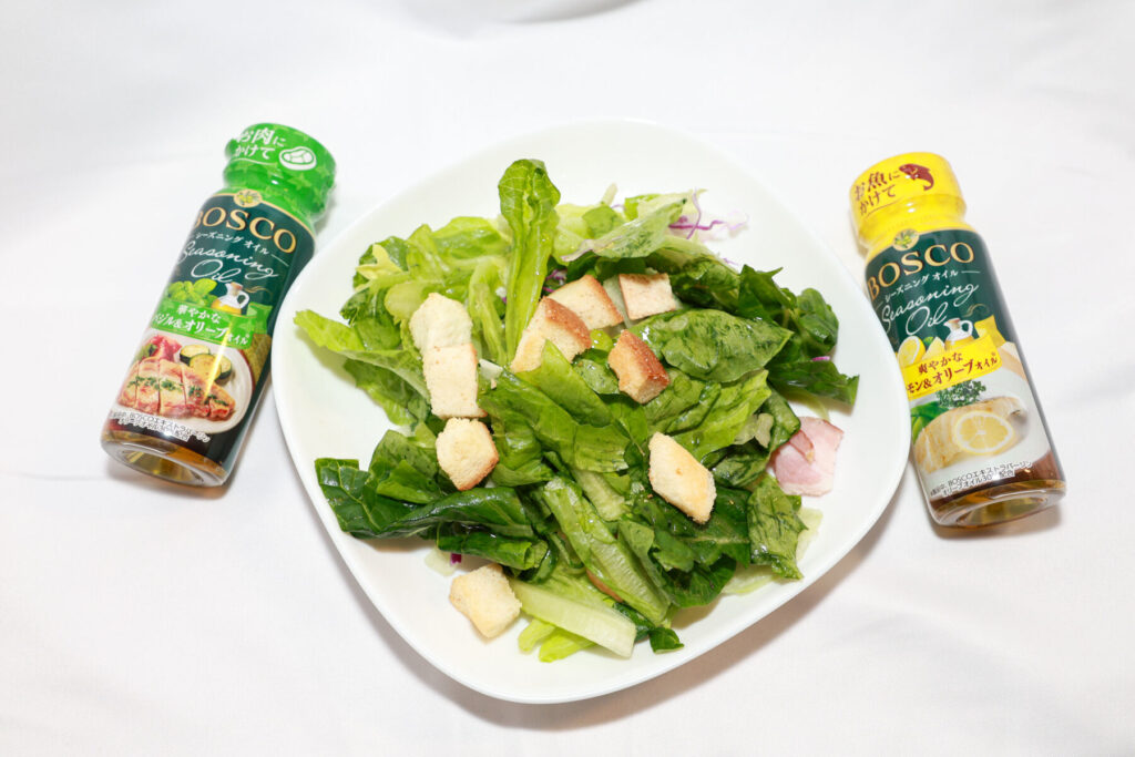 メインレタスのサラダには「レモン&オリーブオイル」と「バジル&オリーブオイル」を試した。どちらのシーズニングオイルもサラダに合いやすく、ドレッシングの代わりにもなり得る。サラダには、ドレッシングをかけた後のプラスアルファでも使えるし、直でサラダに使うのもいいだろう。
