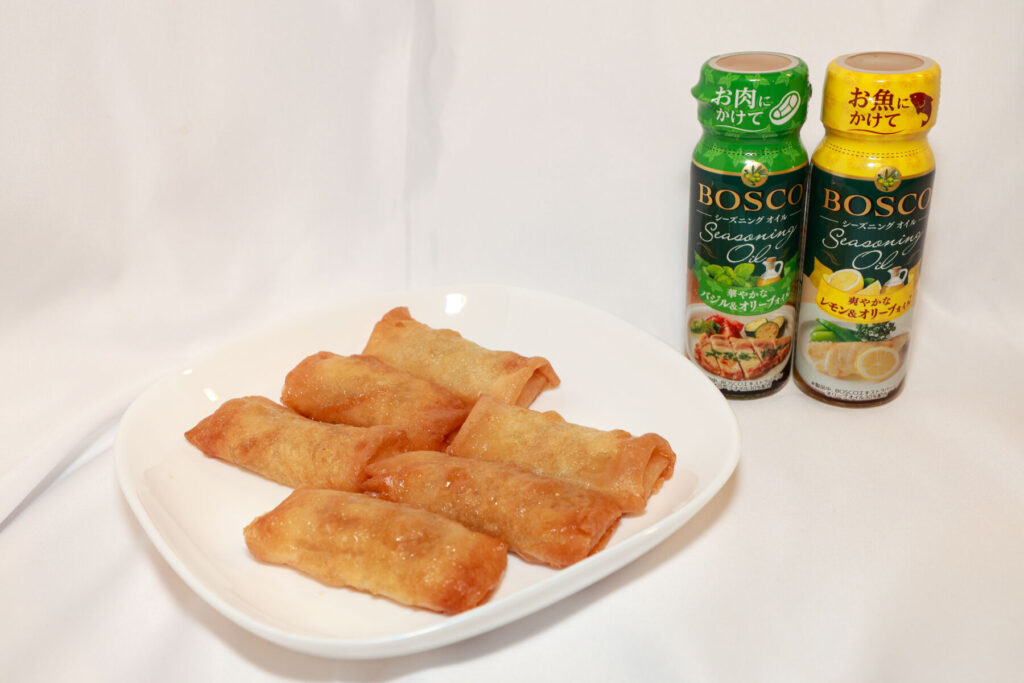 春巻きは本来中華料理であり、普段はしょうゆやからしをつけて食べることが多いが、どちらのシーズニングオイルでもおいしく食べられ、しょうゆも不要なほどの味わいに様変わりする。「レモン&オリーブオイル」ではさっぱりとした風味になり、「バジル&オリーブオイル」はイタリアンを食べているかのような気分になり、どちらも試してみる価値がある。