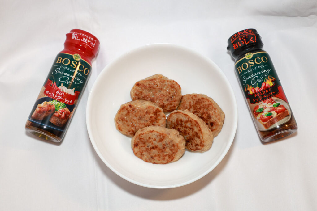 「ローストガーリック」をかけることで、香ばしさとコクが引き立ち、シーズニングオイルだけで十分おいしくハンバーグを食べられる。「レッドペッパー」は数滴でも際立つ辛さで、刺激が足りないなと思ったときにちょうどいい。予想以上の本格的な辛さなので、かけすぎには注意。