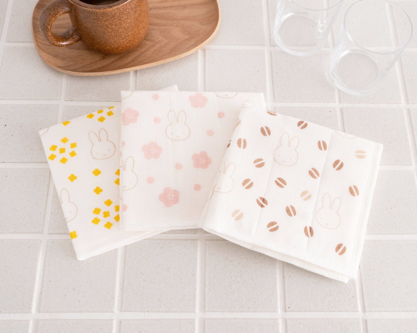 かや生地を七重に重ねたふきんは、洗うたびに柔らかく、ふんわりとした使い心地。目の粗い織りを重ねているため通気性・速乾性に優れ、衛生的にお使いいただけます。清潔感のある白を基調に、お花やコーヒー豆などのモチーフを散りばめ、ミッフィーをシンプルに配置。さりげないデザインとカラーで、キッチンにすっとなじみ、毎日使いたくなるふきんです。