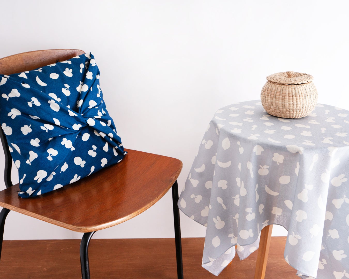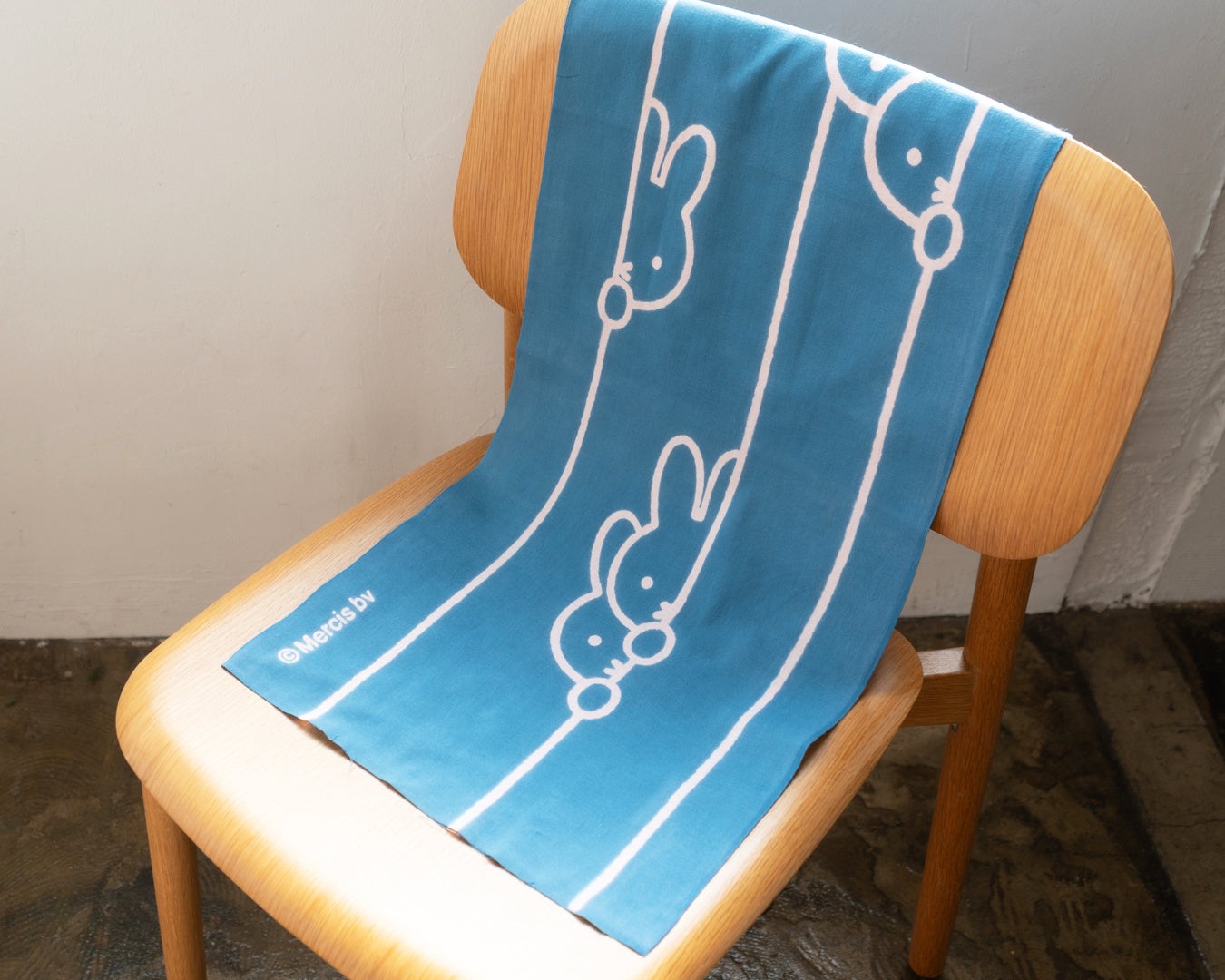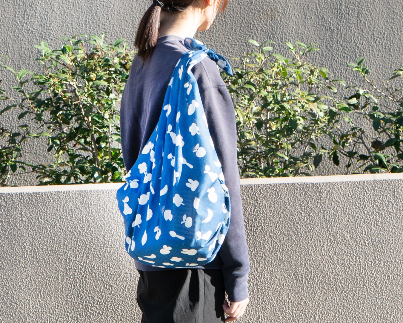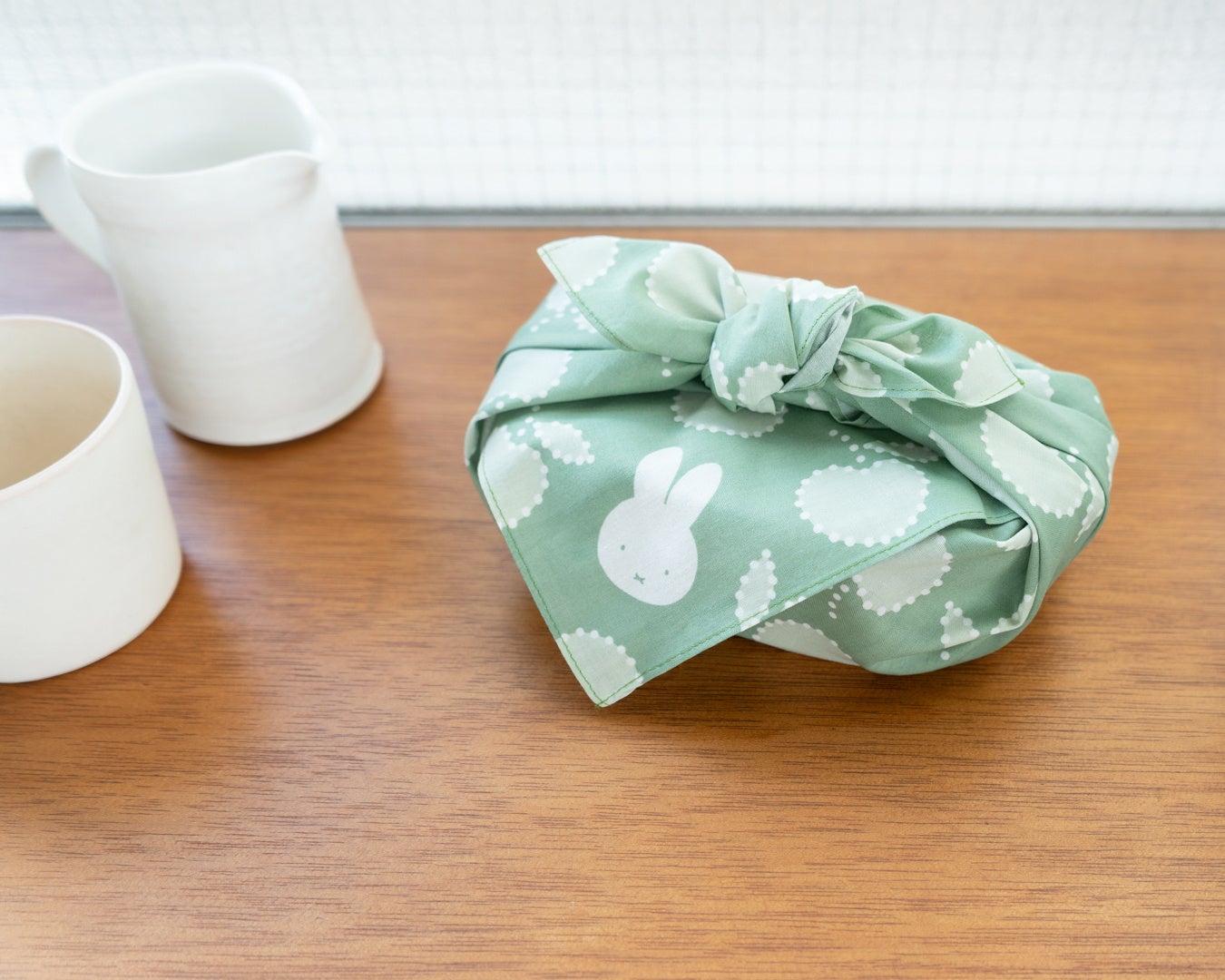 シリーズでは初となる大判サイズの風呂敷。ほどよい透け感としなやかな風合いの生地は結びやすく、荷物をまとめたり、さっと結んでサブバッグにしたり、肌寒い時にはスカーフ代わりにと、多用途に活躍します。ソフトな質感から生まれる美しいドレープは二人掛けのラウンドテーブルやコーヒーテーブルのクロスにもぴったり。大きいからこそデザインはあえてシンプルに、落ち着いた色合いで上品に仕上げました。さりげないミッフィーのモチーフが可愛らしいアクセントに。こちらも小風呂敷と同じく、職人によるハンドプリントで丁寧に染められています。