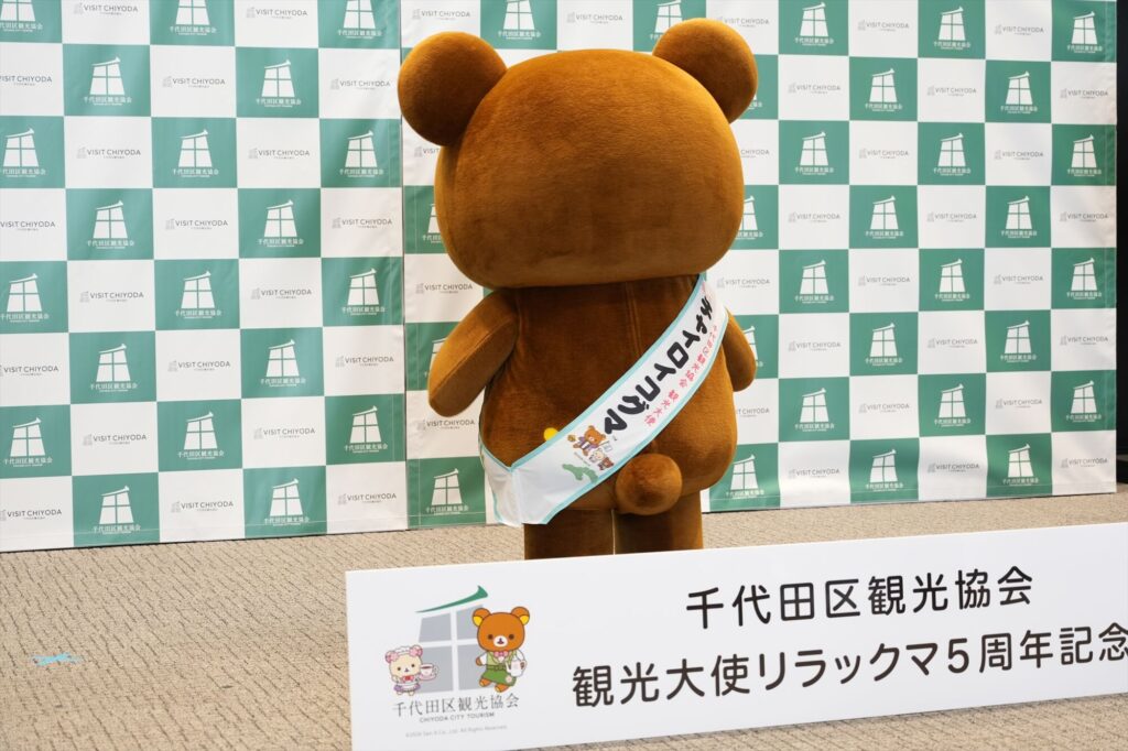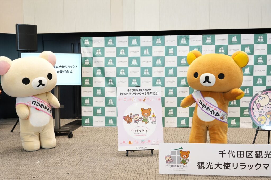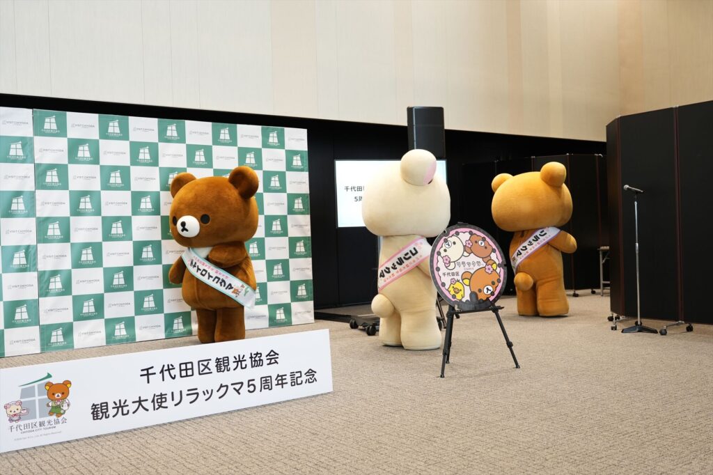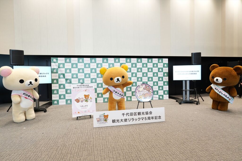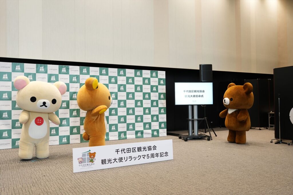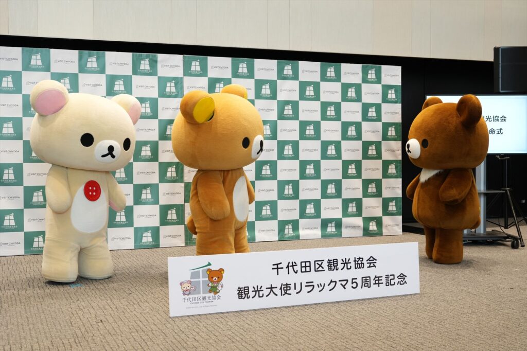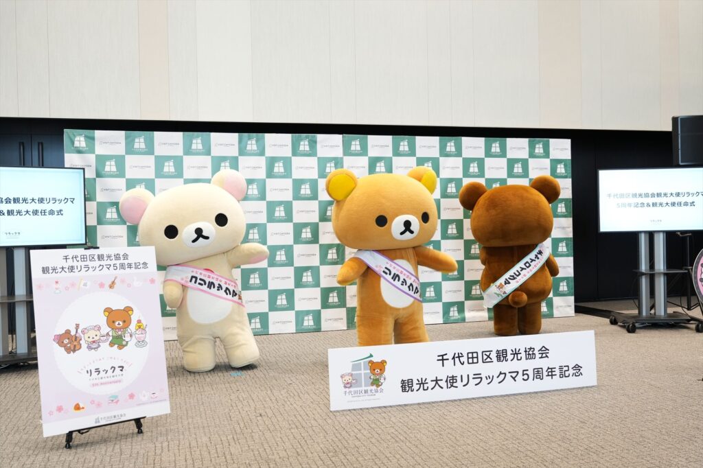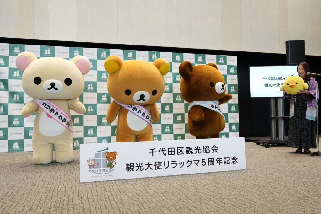 リラックマが千代田区の観光大使に就任してから今年で5年。任命式には、リラックマ、コリラックマ、チャイロイコグマが登場し、それぞれにタスキがかけられ、これまでの功績が表彰された。「神田古本まつり」や「神田カレーグランプリ」など、千代田区内のさまざまなイベントを応援してきた実績が称えられる。