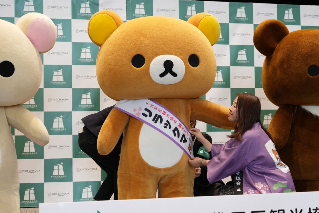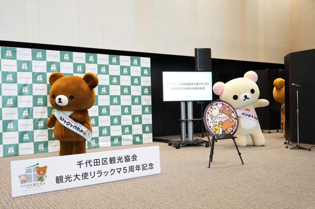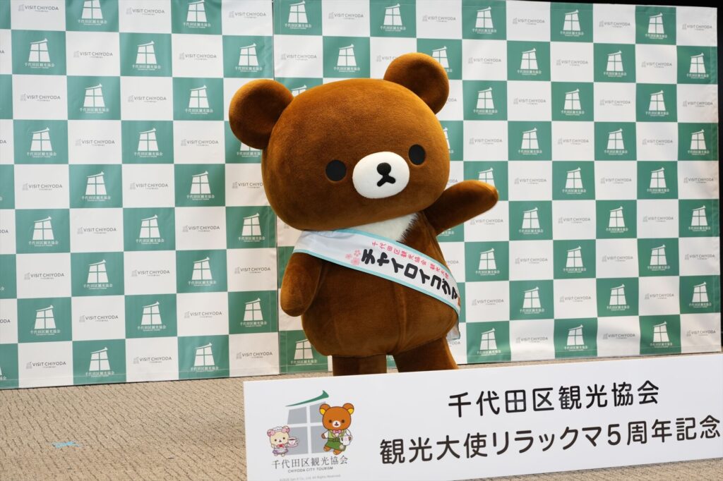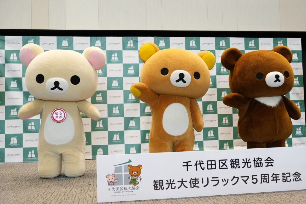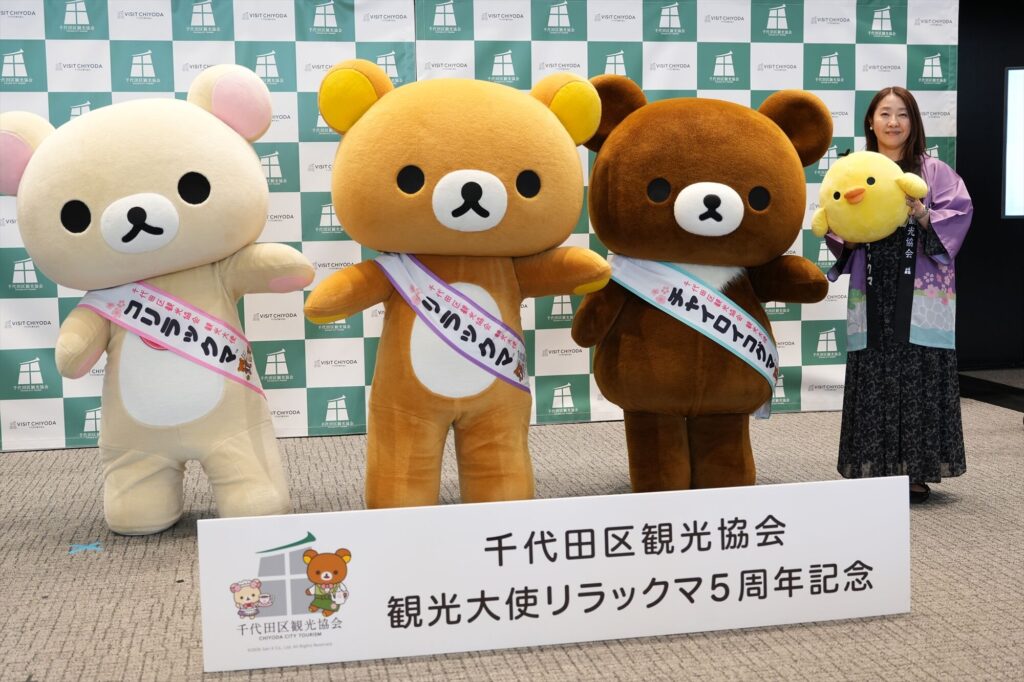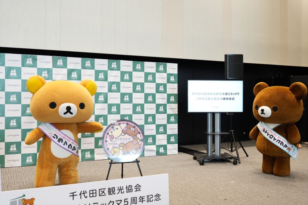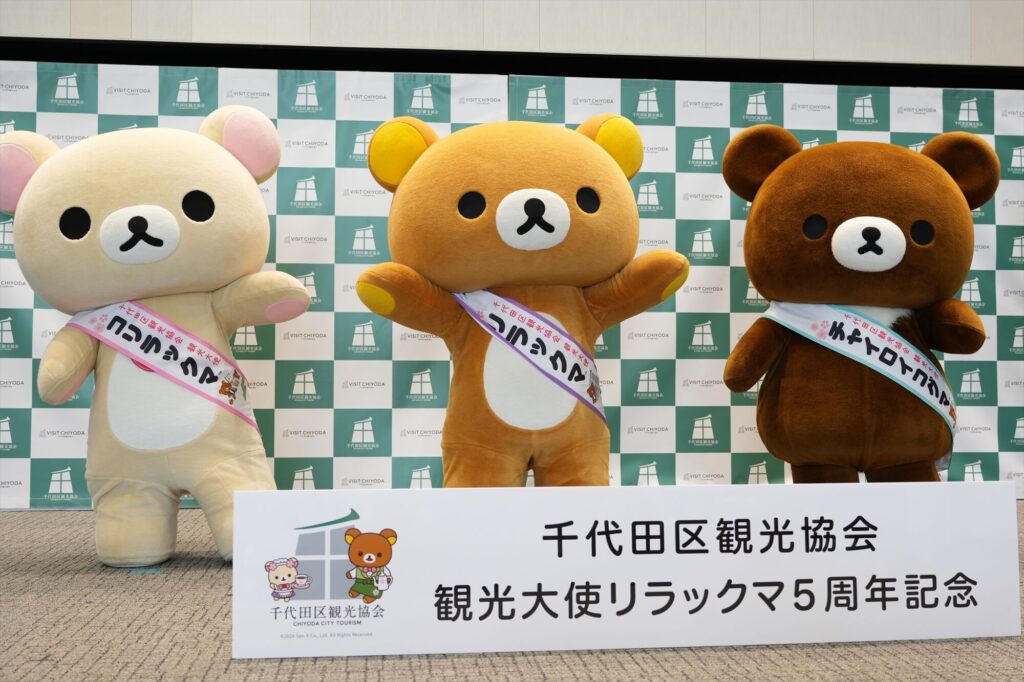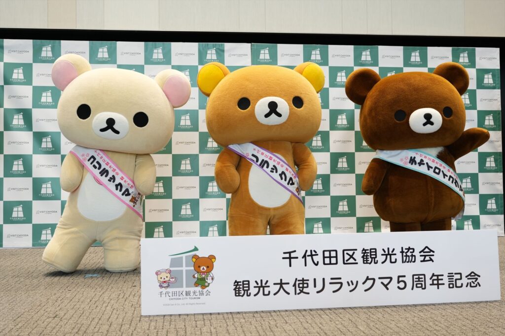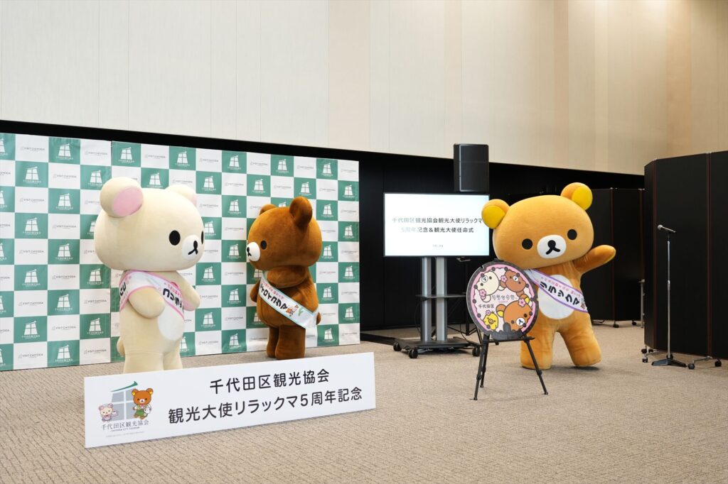 リラックマが千代田区の観光大使に就任してから今年で5年。任命式には、リラックマ、コリラックマ、チャイロイコグマが登場し、それぞれにタスキがかけられ、これまでの功績が表彰された。「神田古本まつり」や「神田カレーグランプリ」など、千代田区内のさまざまなイベントを応援してきた実績が称えられる。