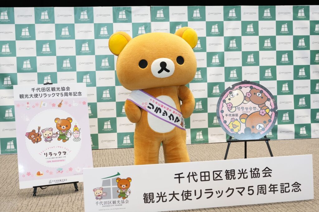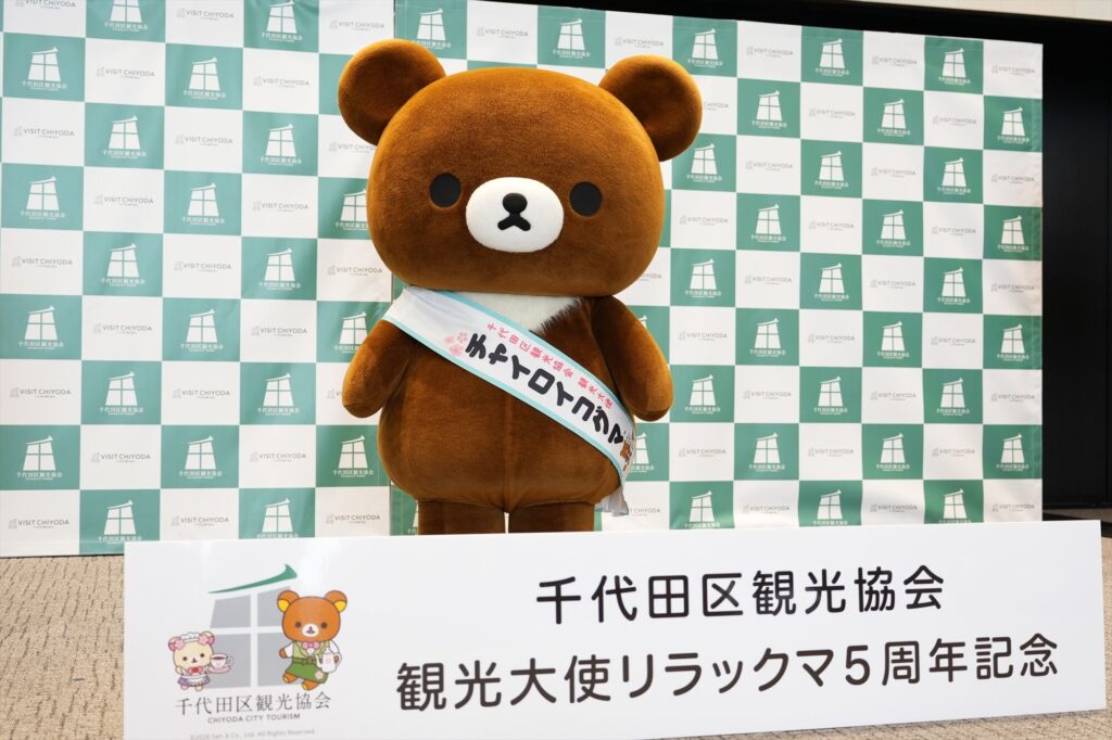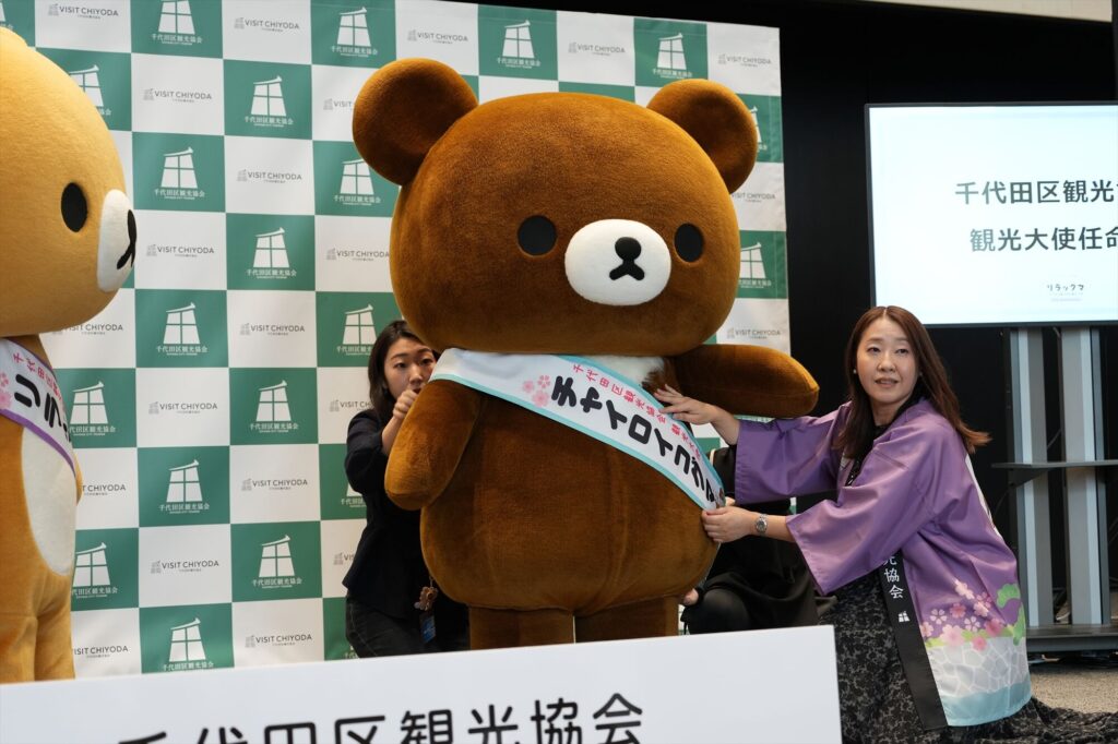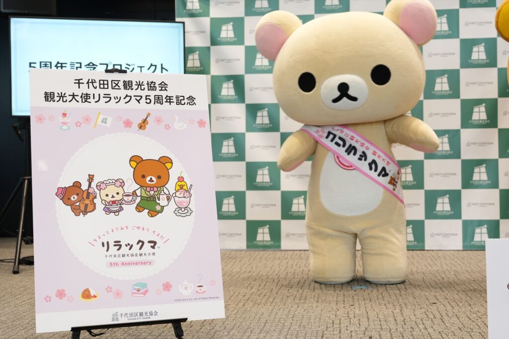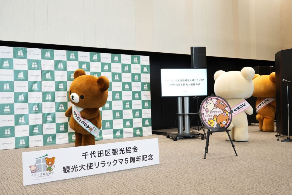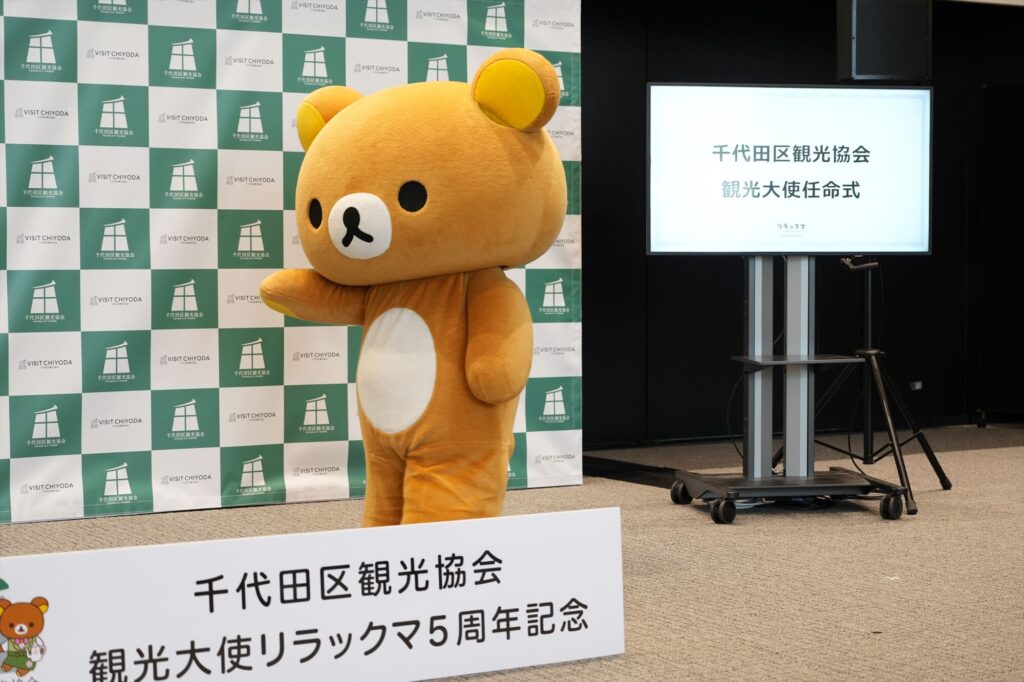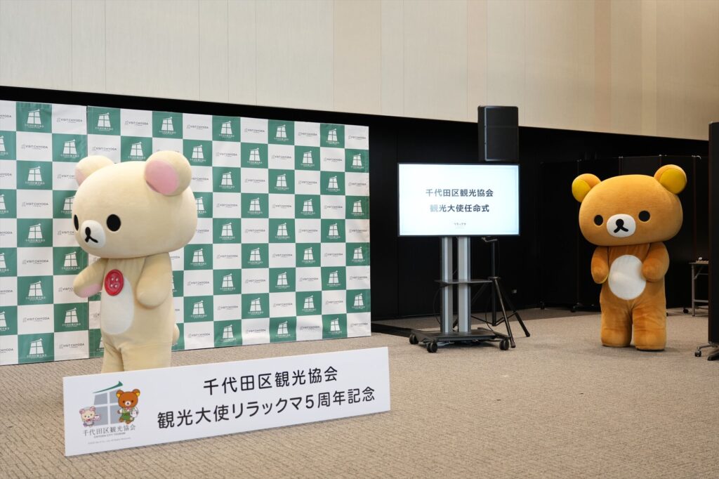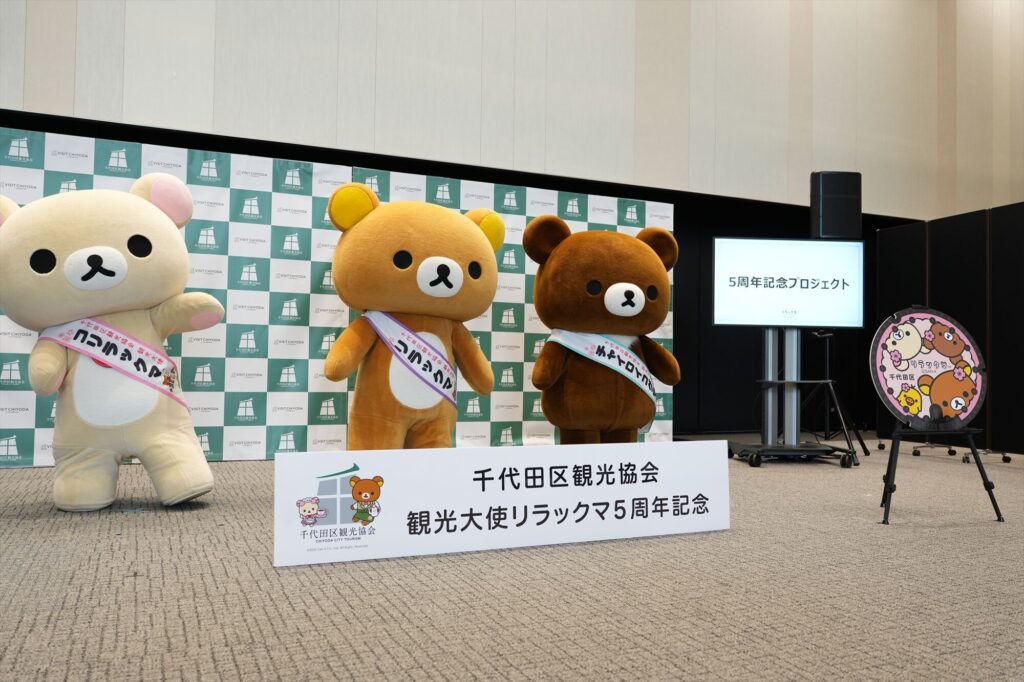 リラックマが千代田区の観光大使に就任してから今年で5年。任命式には、リラックマ、コリラックマ、チャイロイコグマが登場し、それぞれにタスキがかけられ、これまでの功績が表彰された。「神田古本まつり」や「神田カレーグランプリ」など、千代田区内のさまざまなイベントを応援してきた実績が称えられる。