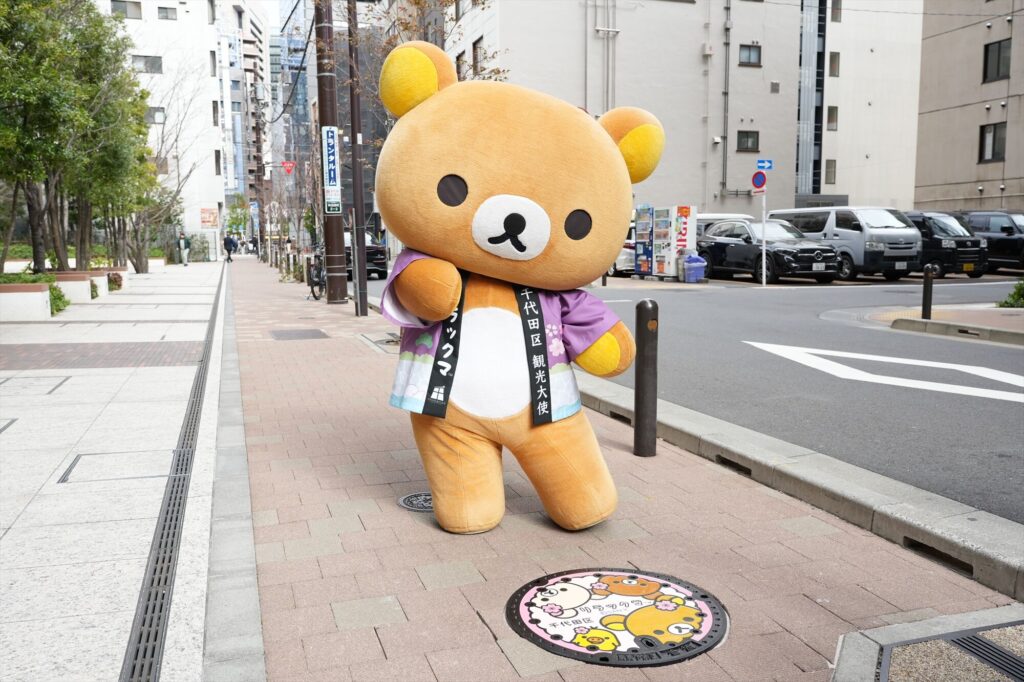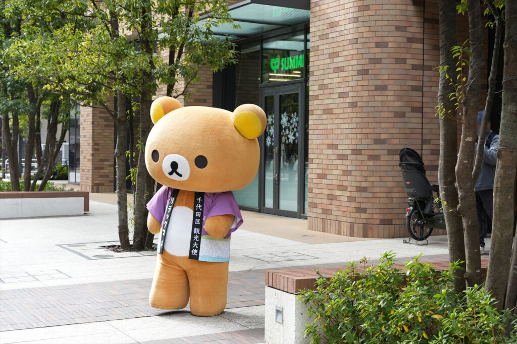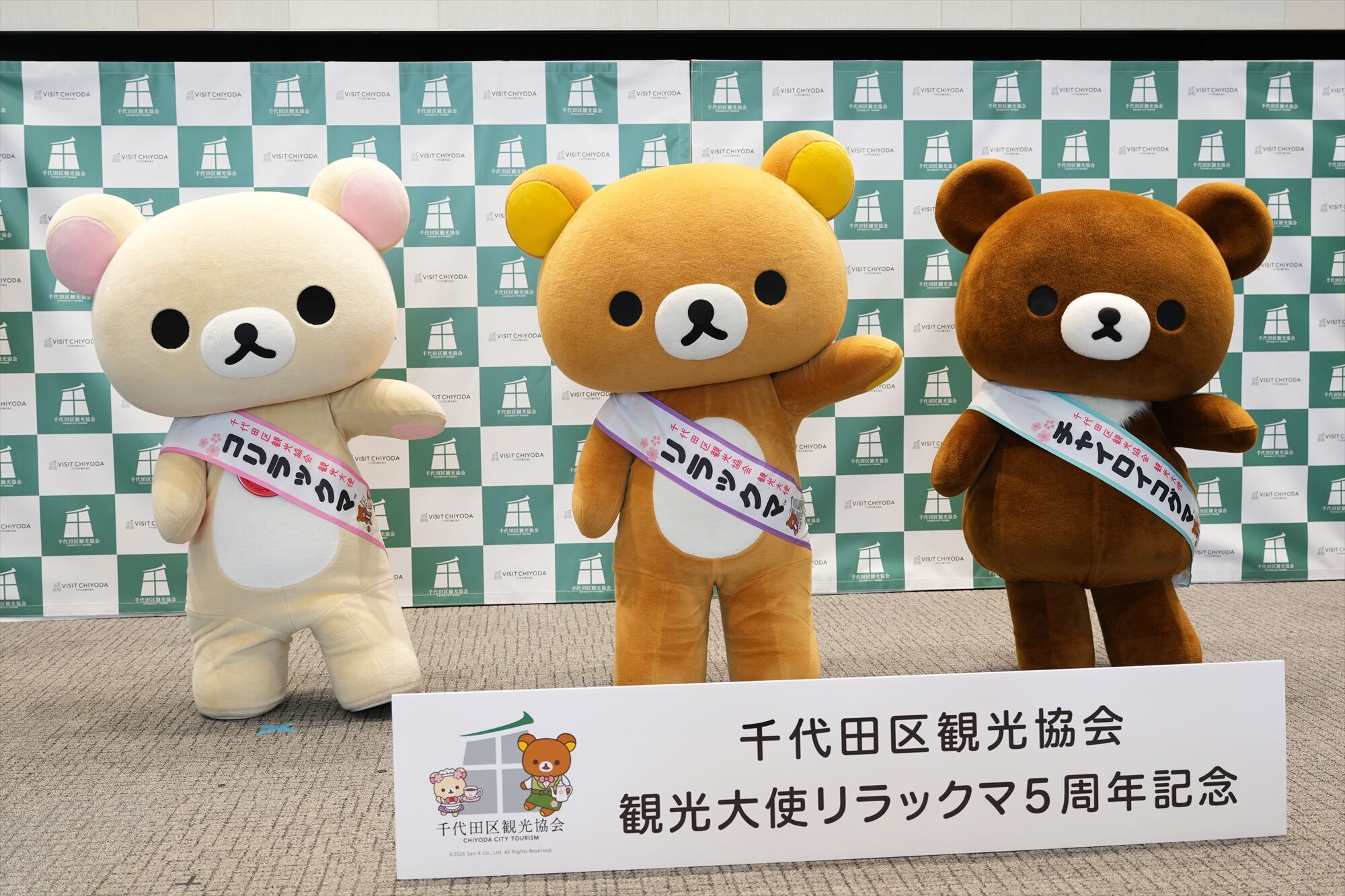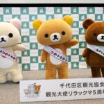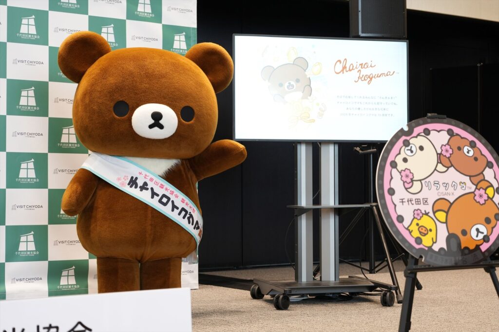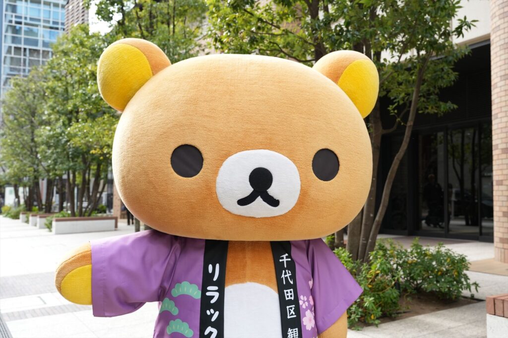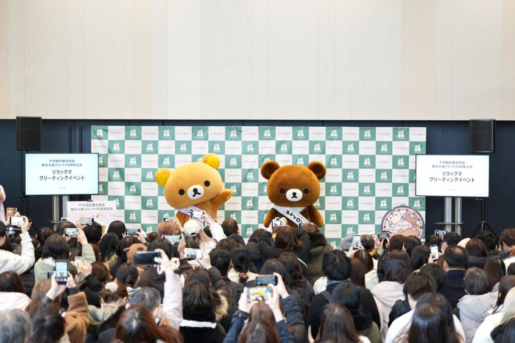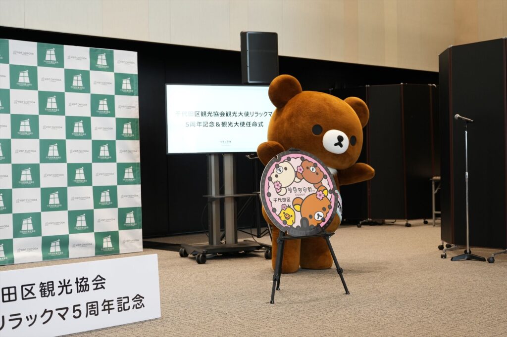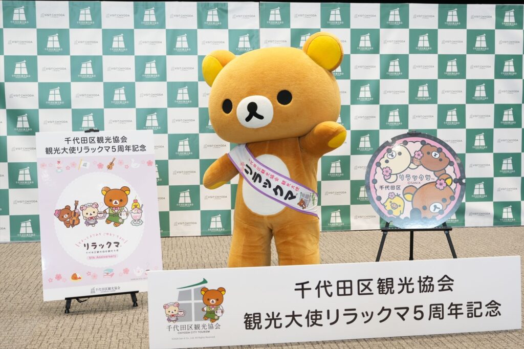 リラックマが千代田区の観光大使に就任してから今年で5年。任命式には、リラックマ、コリラックマ、チャイロイコグマが登場し、それぞれにタスキがかけられ、これまでの功績が表彰された。「神田古本まつり」や「神田カレーグランプリ」など、千代田区内のさまざまなイベントを応援してきた実績が称えられる。