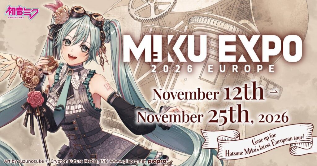 クリプトン・フューチャー・メディアは『初音ミク』による新たな海外コンサートツアー「HATSUNE MIKU EXPO 2026 EUROPE」の開催を決定しました。2026年11月12日のロンドン公演を皮切りに、ブリュッセル、アムステルダム、ベルリン、デュッセルドルフ、パリ、マドリードの7都市を巡ります。各公演のチケットは、現地時間の2026年2月27日午前10時から一般発売予定です。