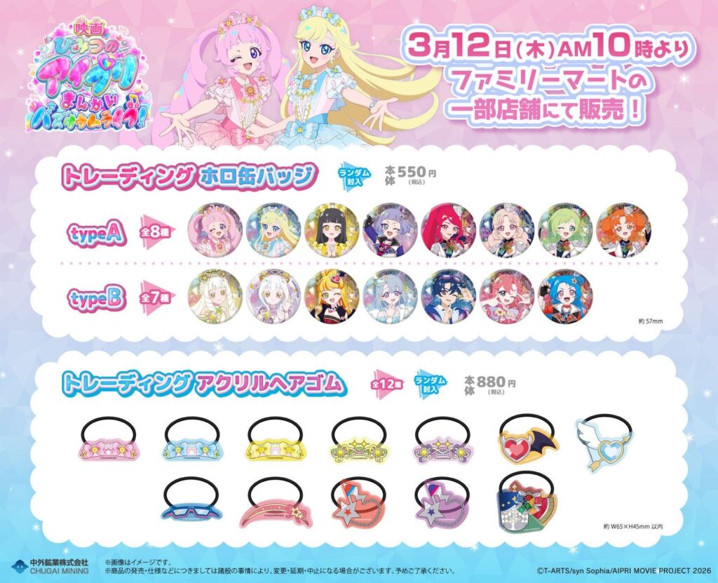 『映画ひみつのアイプリ まんかいバズリウムライブ!』のファミリーマート限定グッズが発売。「トレーディングホロ缶バッジ」や、アイプリたちのコーデ風デザインの「トレーディングアクリルヘアゴム」が登場します。