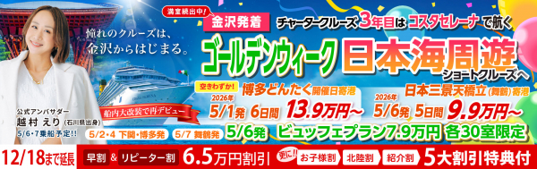 クルーズ予約サイト「ベストワンクルーズ」、2026年ゴールデンウィークにチャーターするコスタセレーナ金沢発着クルーズの早割・リピーター割受付期間を12/18(木)まで再延長いたしました 株式会社ベストワンドットコム