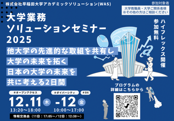 株式会社早稲田大学アカデミックソリューション(本社:東京都新宿区、代表取締役:神馬 豊彦)は、”他大学の先進的な取組を共有し、大学の未来を共に拓く2日間”として、「大学業務ソリューションセミナー」を、12月11日(木)・12日(金)の2日間にわたり開催いたします。今年度で8回目となります。