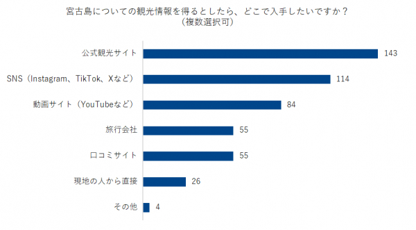 宮古島の観光情報の入手先についてたずねたところ、「公式観光サイト」が143人で最多となりました。次いで「SNS(Instagram、TikTok、Xなど)」114人、「動画サイト(YouTubeなど)」84人、「旅行会社」「口コミサイト」が同率で55人、「現地の人から直接」26人、「その他」4人と続きます。