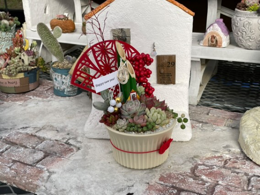 ・多肉植物を使った正月仕様の寄せ植え制作
