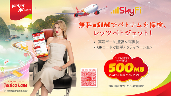 2025年12月31日まで(*)の間、ベトジェット公式サイト https://www.vietjetair.com またはベトジェットエアモバイルアプリでベトナム行きの国際航空券を予約すると、ベトナム国内でご利用いただける高速データ500MBのSkyFi eSIMを無料で受け取ることができます。SkyFi eSIMは目的地の到着日から31日間有効です(**)。予約時のサービスメニューで無料のeSIMオプションを選択すると、eSIMがご登録のメールアドレス宛に送付され、QRコードを読み取るだけで即時にご利用いただけます。
