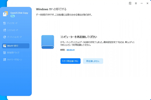 次に、EaseUS Disk Copyの「Win11へ移行」機能を使って、実際にHDD/SSDをクローンする手順について紹介します。