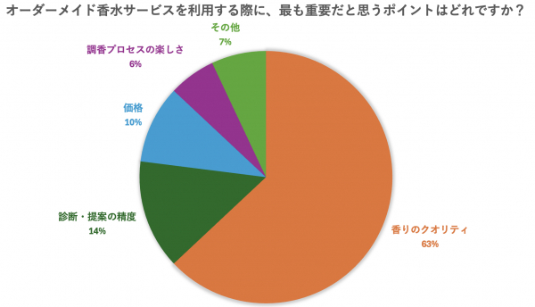 評価ポイントとしては「香りのクオリティ」が最も多く選ばれましたが、これは香水という商品の性質上当然の傾向ともいえます。一方で、「診断・提案の精度」や「調香プロセスの楽しさ」などにも票が集まり、香り以外の価値も求められていることが示されました。