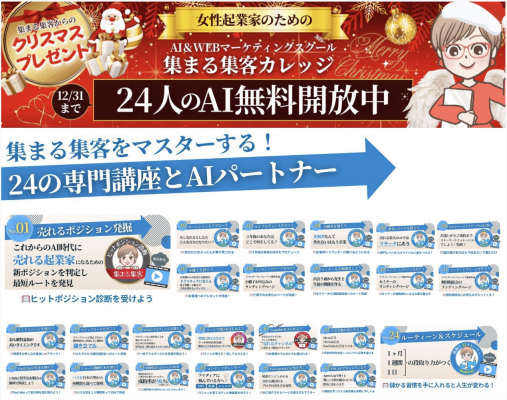 株式会社アクティブノート(東京都調布市、代表取締役社長:長瀬葉弓)が運営する女性起業家のAIとWEB集客の総合研究所「集まる集客(R)総研( https://www.active-note.jp/ )」のオンラインサロン集まる集客カレッジがキャンペーン「年末商戦・報酬MAX応援企画!集まる集客カレッジ24個のBuddy@i無料解放キャンペーン」を開催します。