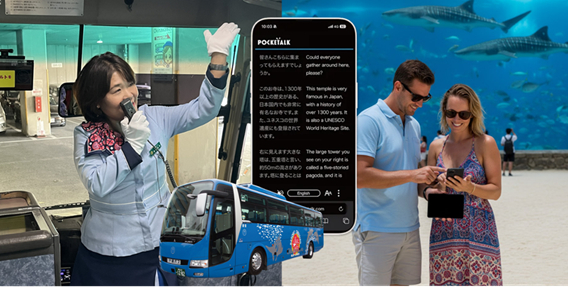 これらの社会課題を解決するため、WILLER ACROSS、モバイル・プランニング、沖縄バスの3社は、お客様ご自身のスマートフォン等の端末を活用して手軽に多言語コミュニケーションが行える多言語AI翻訳ツール「ポケトークforツアー」の実証実験を、沖縄バスが運行する定期観光バスにて約1年間実施します。