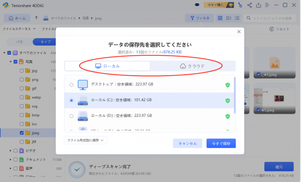 3.右下の「復元」をクリックし、SDカード以外の保存場所を選択し、例えばOneDriveまたはGoogle Driveなどのクラウドディスクに保存することを検討してください。