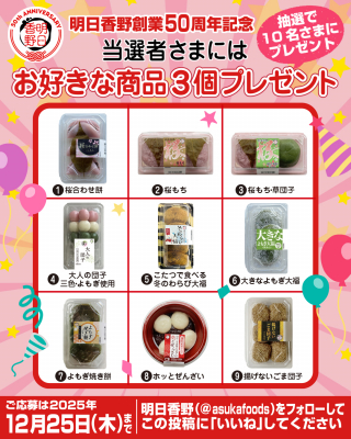 このたび、西日本の人気和菓子9商品のなかから、当選者が3商品を選べるキャンペーン「明日香野創業50周年記念 お好きな商品3個プレゼント」を開始しました。キャンペーンの開催期間は2025年12月8日から12月25日までとなります。