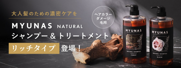 「ミュナス ナチュラル ヘアケアシリーズ」は、12種類の天然エキスを配合し、植物由来成分を中心に作られた、髪や頭皮に優しいボタニカルヘアケアです。年齢を重ねた頭皮、パサつきが気になる髪に潤いを与えてナチュラルに仕上げ、スタイリングしやすい髪に導くロングセラーシリーズとなっております。