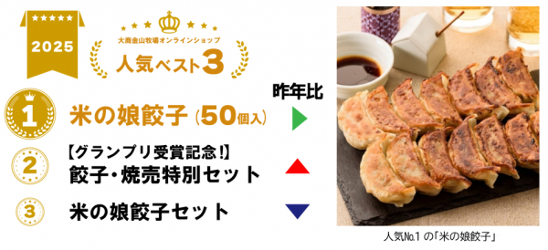 2025年人気ベスト3もすべて『米の娘(こ)餃子』が入った商品で、人気No.1は『米の娘餃子(50個入)』でした。「米の娘餃子(30g×10個入)」は、2024年7月、第77回「ジャパン・フード・セレクション」にて食品・飲料部門の最高賞であるグランプリを受賞。当社のブランド豚「米の娘ぶた(R)」と金山町の特産品であるニラを使い、金山町にある自社工場「米の娘家」で製造された、肉と野菜の旨みがギュッと詰まった餃子です。