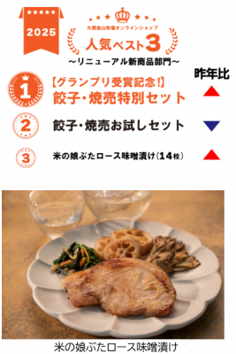 さらに今年は大容量の「米の娘ぶたロース味噌漬け(14枚)」が3位に入賞しました。14枚入りは自宅用の需要が高く、冷凍庫にストックする方や時間がないときのもう1品として使用される方が多いようです。山形県産米から 製造した純米大吟醸酒粕と山形県産ぶどうの赤ワインを使用しています。地元・山形県産にこだわり、酒粕の芳醇な香りでより品のある味わいに仕立てた味噌に、柔らかい部分を厳選し「米の娘ぶた」のロースを漬け込みました。解凍後に焼くだけで手軽に「米の娘ぶた」をお楽しみいただけます。
