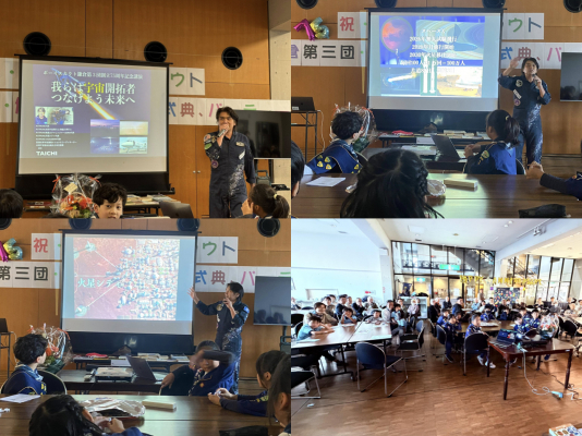 ●昨日は忙しい中、素敵な講演をありがとうございました。 子供たち含めて、皆さん普段聞けない話が聞けて興奮状態でした。 宇宙というのはとてつもなく遠い場所のようなイメージでしたが、 大地君の話の中で、手に届く未来がすぐそこにあり、思いついたら 即やっていかないと2番煎じになるという言葉が非常に印象的でした。 世の中は目まぐるしく動いていて、ボーイスカウトの置かれている環境は 僕らの少年のころに比べると、少し窮屈な感じがするかもしれません。 でも子供たちが(大人も)未来を創造することは自由で無限大だし、 挑戦・冒険する気持ちも年齢に関係なく持ちづづけてよいのだと、 改めて気づかされた感じです。 貴重な話を本当にありがとうございました。忙しい身だと思いますが、 お身体に気を付けて夢に向かって突き進んでください。応援しています。 また何かイベントがあるとき声かけさせていただきます。 今後ともよろしくお願いします。