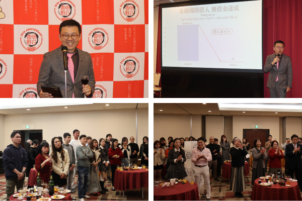 式典は代表取締役社長・此下竜矢によるベトナム語でのスピーチから始まりました。約10年で事業利益が5.6倍に増加したことや、金融機関からの借入金が2025年12月で0になったこと、今年はボーナスも最高水準にすることができ、働く皆さんと喜びを共有できて嬉しいと伝えました。