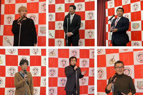 式典では、経営陣一人一人からのあいさつや東日本工場長小野塚による感謝のメッセージなど行われました。歓談中はスクリーンにて、明日香野の50年の歩みと従業員の皆さんへの感謝を伝える動画の上映も行われました。また、会場には、創業当時からの歴史を伝えるパネルやお客様からの声を記したディスプレイ、明日香野がサポートするアスリートを紹介するパネルなどが飾られました。