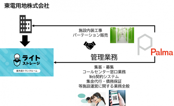 セルフストレージ(トランクルーム等のレンタル収納スペース)に関する運営サービス・施設開発事業を展開する株式会社パルマ(以下「当社」)と、東電用地株式会社(以下「東電用地」)は、東電用地が新規事業として開始するセルフストレージブランド「ライトストレージ」について、セルフストレージ運営の管理受託契約を締結しBPO業務を受託することになりましたので、お知らせいたします。