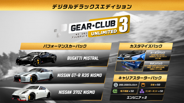コピーライト:(C)2025 published by Nacon S.A. and developed by Eden Games. All right reserved. “Gear Club” is a registered trademark of Eden Games. All rights reserved. The manufacturers, cars, names, brand and associated imagery featured in the game are trademarks and/or copyrighted material of their respective owners. Published and distributed by 3goo K.K. in Japan.