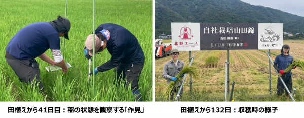田植え後、収穫までの稲管理は吉田酒造蔵人の皆様にバトンタッチ。これまでの稲成長過程は「米作り観察記録」として、現地から届いた成長過程をプロジェクト特設ページ(1)にてご紹介してきました。田植えから41日目時点で、既に稲は44cmの高さに成長。今年度は水不足の心配もある中、みるみると成長し、田植えから132日後の10月初旬に無事収穫を迎えました。