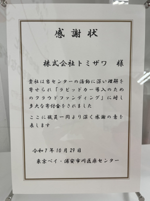 リユース事業を中心に、幅広く事業を展開するトミザワグループの企業として、オフィス家具や家電、ビジネスホンなどのリユース事業、トランクルーム事業やバイク駐車場事業まで幅広く展開する株式会社トミザワ(本社:東京都江戸川区、代表取締役社長:池島 隆)は、東京ベイ・浦安市川医療センターが実施する「ラピッドカー導入プロジェクト」に賛同し、地域医療のさらなる質向上に向けて支援を行いました。