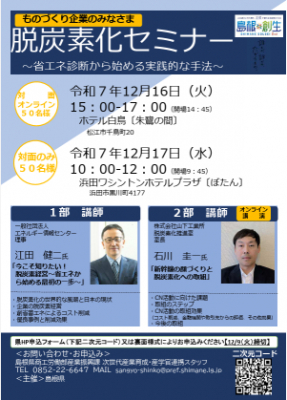 本セミナーは 2025年12月16日(会場およびオンライン併用)および17日(会場開催) に開催され、県内製造業を中心とした事業者が参加しました。