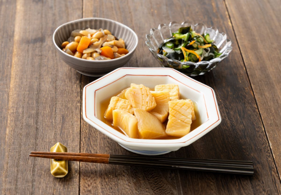 青森県 八戸漁港で水揚げされたアカイカを使用しています。水揚げ後にすぐに急速冷凍し、旨味を閉じ込めたアカイカ(ムラサキイカ)は、身が厚く、加熱しても硬くなりにくく、旨味と甘みがしっかりあるのが特徴です。イカは食べやすく味がしみ込みやすいように松笠切りにし、大根と厚揚げと一緒に炊合せています。