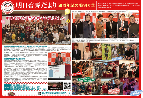 特別号その3では、2025年12月13日に千葉県・野田市の「クリアビューゴルフクラブ&ホテル」にて開催した「明日香野創業50周年記念パーティー」の様子をお届けしています。東日本工場の100名近い従業員とともに50周年を祝い、これからも「もっと働きやすい職場」を目指すと宣言されたパーティーの様子をぜひご一読ください。