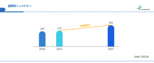 LP Informationの最新調査レポート「世界製鋼用フェロチタン市場の成長予測2025~2031」(https://www.lpinformation.jp/reports/50345/ferro-titanium-for-steelmaking)によれば、当該市場は2025年から2031年の予測期間中、年平均成長率(CAGR)5%で拡大し、2031年には世界市場規模が2.92億米ドルに達すると予測されている。