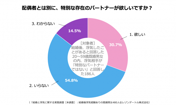 「配偶者とは別に、特別な存在のパートナーが欲しい」と回答した人は約31%、「いらない」と回答した人は約55%となりました。
