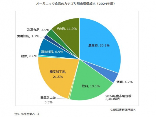 2024年度の国内オーガニック食品市場規模(農産物と加工食品の合計)は小売金額ベースで、前年度比2.6%増の2,403億円と推計した。