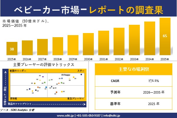 SDKI Analytics(本社:東京都渋谷区)は、このたび、2025年11月29に「ベビーカー市場調査レポート:2026-2035年の市場規模、シェア、傾向の予測」を発表しました。ベビーカーに関する市場調査レポートには、統計的および分析的アプローチを使用した予測評価が含まれています。この調査レポートでは、一次および二次調査方法を使用して分析された主要な業界洞察を通じて将来の傾向を理解できるようにすることで、主要な市場動向を読者に説明しています。