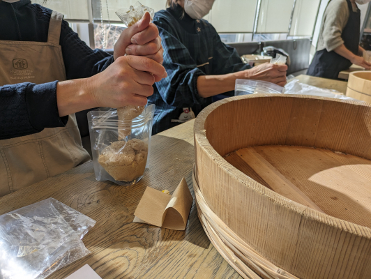 本イベントでは、発酵が穏やかに進む冬の特性を生かし、国産大豆と兵庫県産麹を使って醤油と白味噌を仕込みます。仕込んだ発酵調味料は持ち帰り、自宅で変化を見守ることで、発酵を暮らしの中で理解する体験としました。