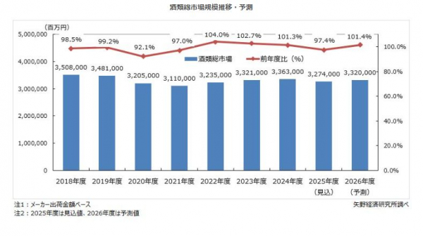 2025年度の酒類総市場は前年度比97.4%の3兆2,740億円と4年振りの縮小を見込む。ビールの価格上昇による購買意欲の減退や酒類メーカーのシステム障害による出荷制限が影響する見込みである。2026年10月に予定されるビール類酒税一本化により、発泡酒や新ジャンルの需要減退が鮮明となる一方、ビールやRTDの消費活性化の影響で2026年度の酒類総市場は拡大に転じ、前年度比101.4%の3兆3,200億円と成長を予測する。